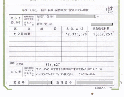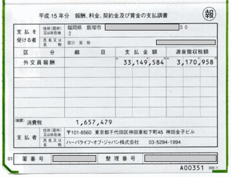 ※この収入はあくまでも個人の努力の結果であり すべての方にこの収入をお約束したものではありません 2003年度の収入 源泉徴収後 年収 約3310万円 2002年度の収入 源泉徴収後 年収 約1230万円 2001年度の収入(参考) 源泉徴収後 年収 約570万円 ※この収入はあくまでも個人の努力の結果であり すべての方にこの収入をお約束したものではありません